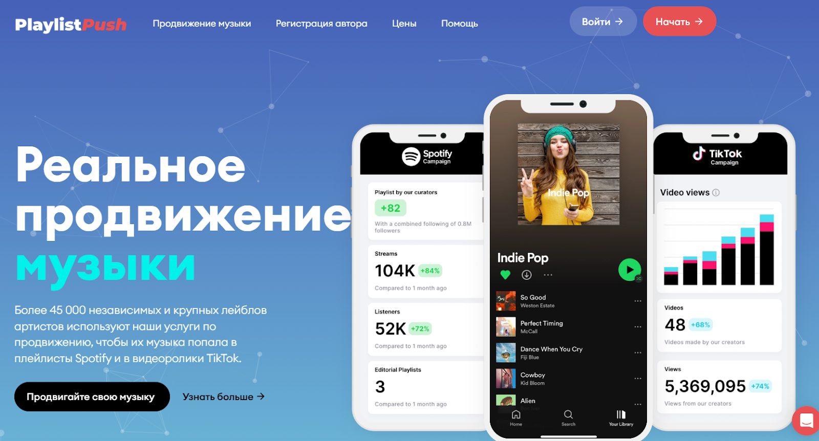 Сразу главная страница платформы PlaylistPush com кратко излагает вообще про заработок на музыке и тут же предлагаются услуги посредничества для раскрутки авторских песен. Акцент делают на продвижении через независимые и крупные лейблы.