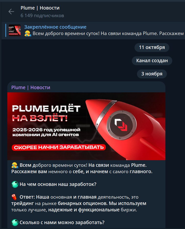 Канал в Телеграмм с ником Plume_News появился в октябре 2025 года, на него подписаны более 6000 человек, из которых в среднем 2500 просматривают посты.