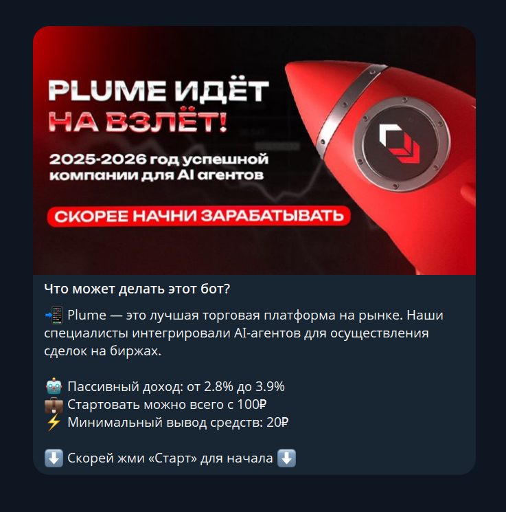 Проект в Телеграм с ником Plume_Onebot предлагает зарабатывать на инвестициях в торговлю криптовалютами, а владельцы обещают полностью пассивный доход. В этой статье расскажем, за счет чего получается прибыль и можно ли ее действительно вывести.