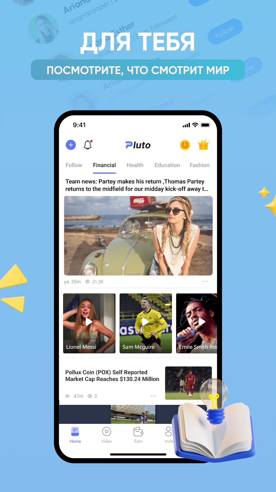 В приложении для заработка Pluto пользователь активно использует личный кабинет. В ЛК можно посмотреть не только баланс, а и актуальный список заданий. Если более детально, то учетная запись имеет следующие разделы: Home, Video, Earn, Invite. В первом пункте представлены актуальные новости.
