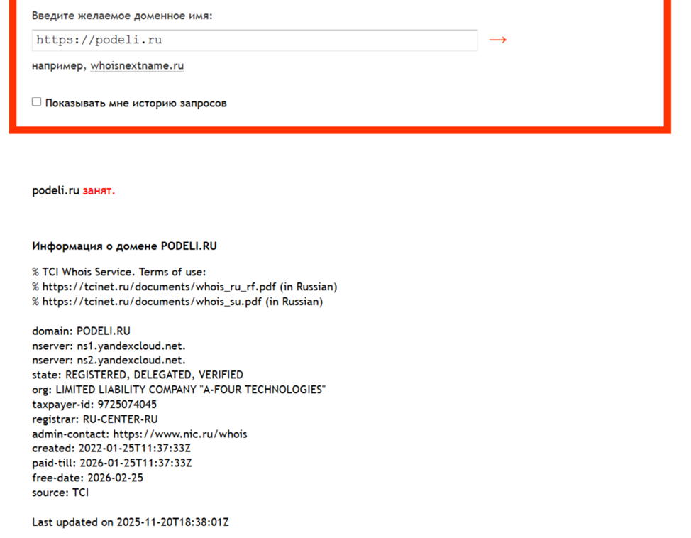 Когда пользователи узнают, какого банка сервис «Подели», возникает вопрос, почему этот сайт обманывает людей. Причем администрация проекта скрывает даже дату регистрации. Проверка домена показала, что он зарегистрирован в 2022 году, но данной площадке он перешел не так давно.