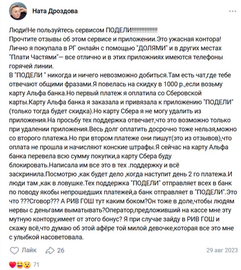 Сервис оплаты покупок по частям «Подели» имеет отрицательную репутацию. В сети о нем найдены только негативные комментарии. Пользователи отмечают, что площадка ведет обманную деятельность. Все денежные средства с платформы исчезают, а попытки что-то выяснить успеха не имеют.