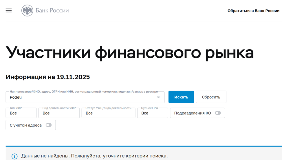 Когда известно, кому принадлежит сервис «Подели», возникает вопрос, почему платформа ведет мошенническую деятельность. У этой площадки нет лицензии Центрального Банка РФ. Значит, платформа ведет незаконную деятельность. Производить расчеты с помощью сайта и приложения опасно из-за финансовых рисков.