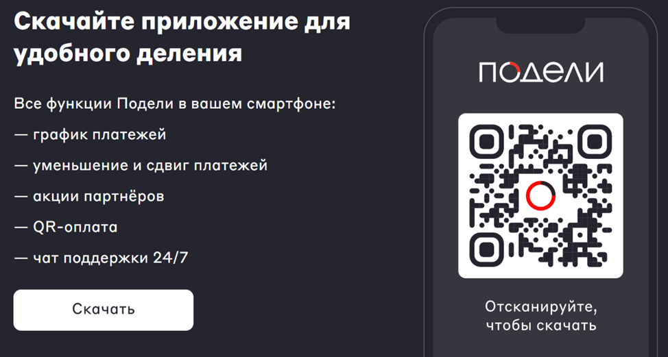 Отзывы о сервисе Podeli Ru App свидетельствуют о наличии приложения. Там указан график платежей и есть акции партнеров. Предлагается оплата QR-кодом и круглосуточная поддержка. Также можно уменьшать и сдвигать платежи. Нужно просто скачать программу и установить, следуя подсказкам на экране.