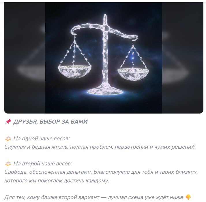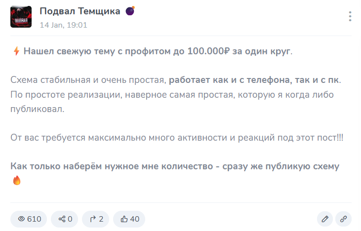 В телеграм-канале пользователи могут увидеть несколько типов контента. Один из основных – призывы подписчиков начать действовать, перестать жить бедной жизнью и начать жить богатой. Для этого всего лишь требуется следовать советам автора и работать по предложенным схемам. Таких публикаций, многие из которых носят примитивный характер, достаточно много, особенно когда нет новых инструкций от «темщика».