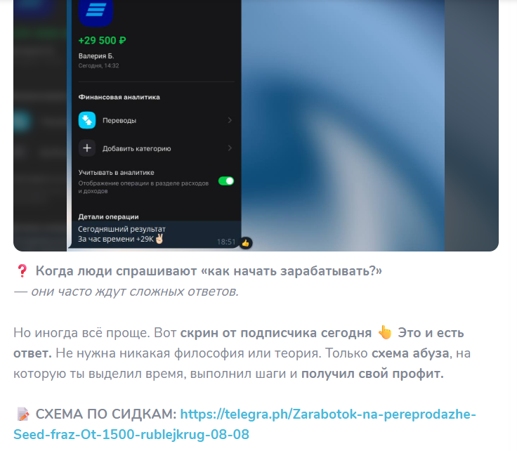 Также в телеграм-канале «Подвал темщика» рассказываются схемы заработка на открытии банковских карт, сервисов онлайн-магазинов, перепродаже сид-фраз. Анализ контента показывает, что тут есть как варианты заработка без вложений, так и с обязательными взносами. В частности, иногда требуется делать первые платежи, пусть и минимальные. С учетом того, что оплата проводится на неизвестных и часто сомнительных сервисах, пользователи рискуют потерей платежных данных.