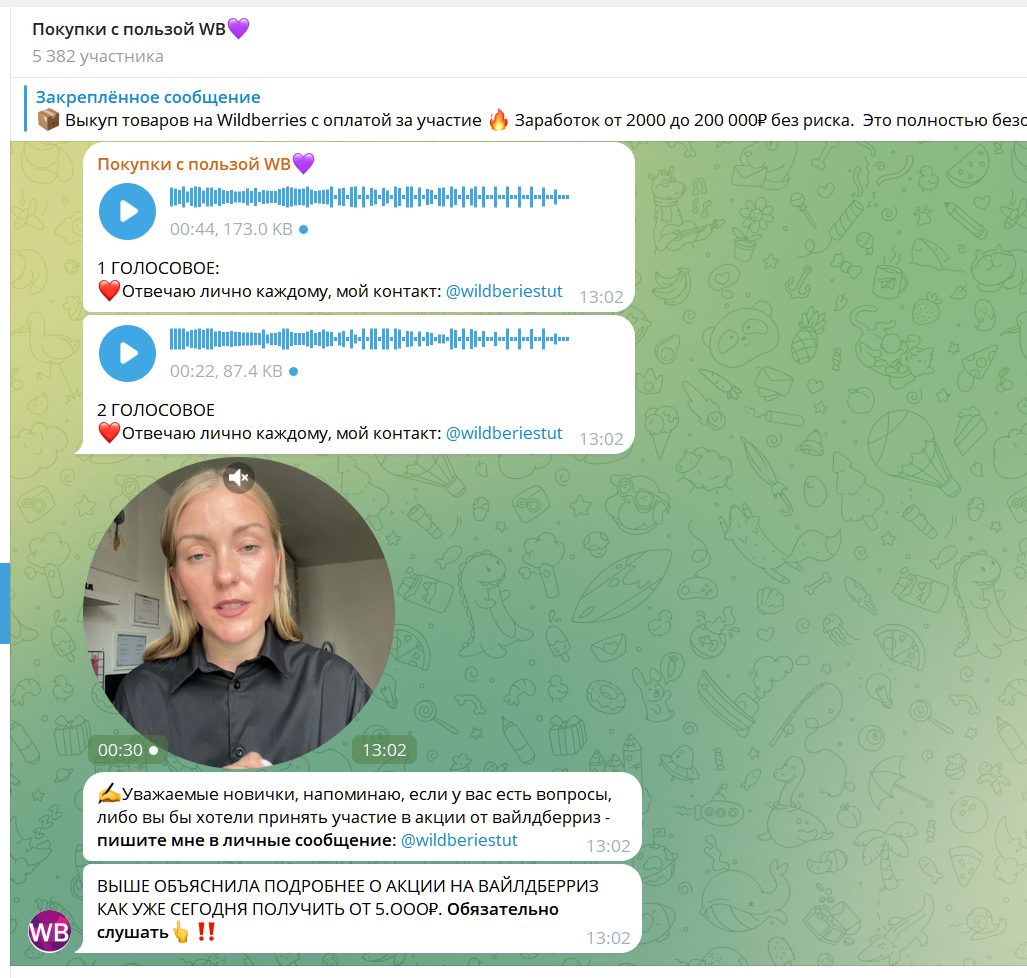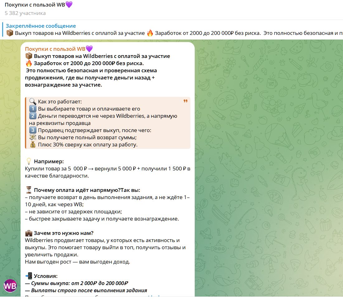 Алгоритм мошенничества в ТГ канале «Покупки с пользой WB»