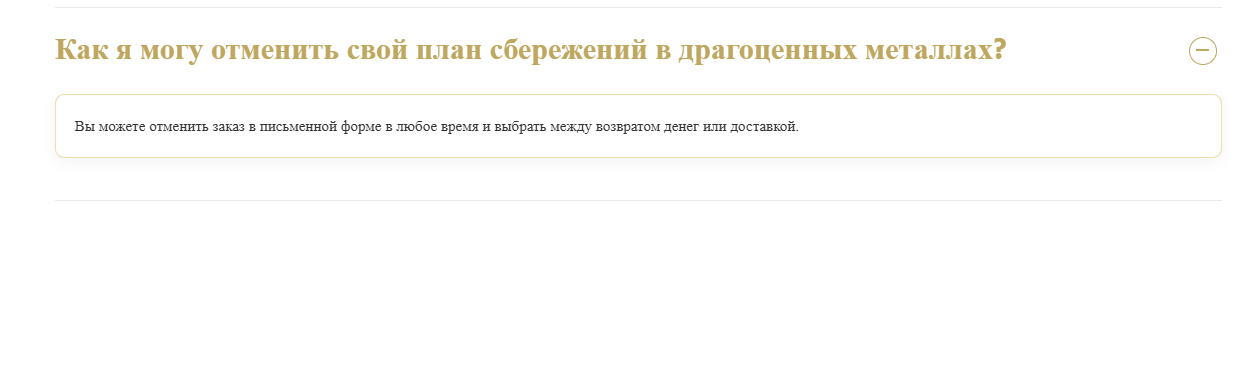 Условия вывода средств прописаны размыто. Инвесторам предлагается сначала заполнить заявку на вывод в предложенной форме. В разделе FAQ указано, что инвестор может в любое время отказаться от плана ивестиций и выбрать один из вариантов возврата средств. Не совсем ясно, что понимается под доставкой, вероятно, имеются в виду друг. металлы, якобы купленные за внесенные инвесторами средства.