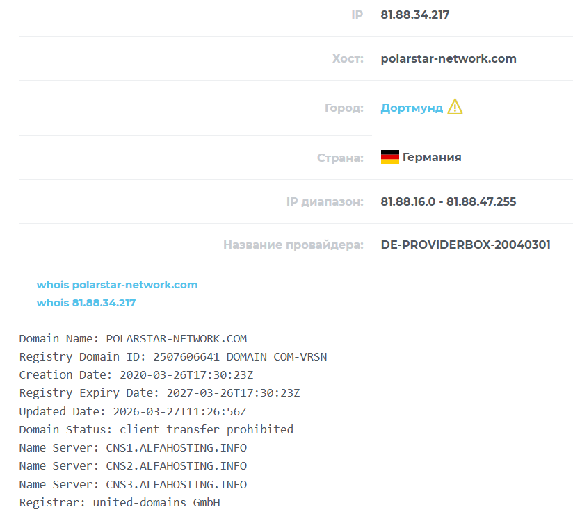 Сайт Polarstar Network Com функционирует на момент написания обзора (апрель 2026). Дата регистрации домена по данным публичных WHOIS-сервисов — относительно недавняя, точная дата скрыта через Cloudflare-прокси.