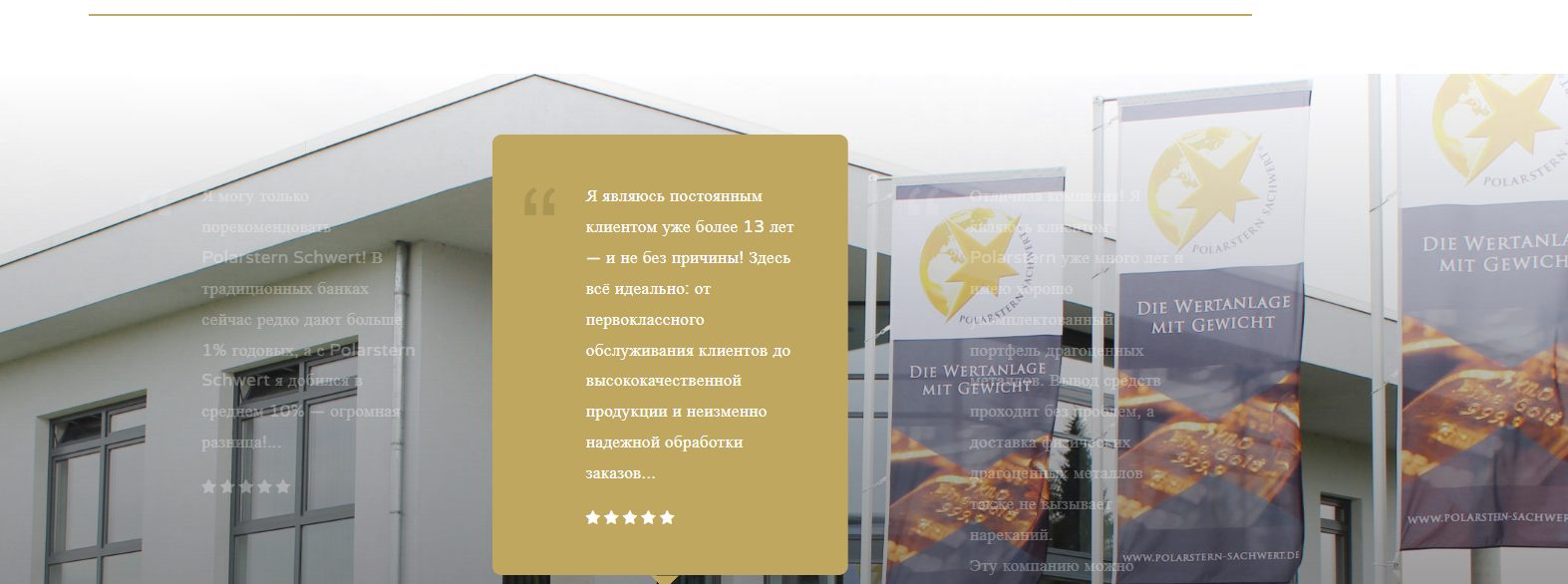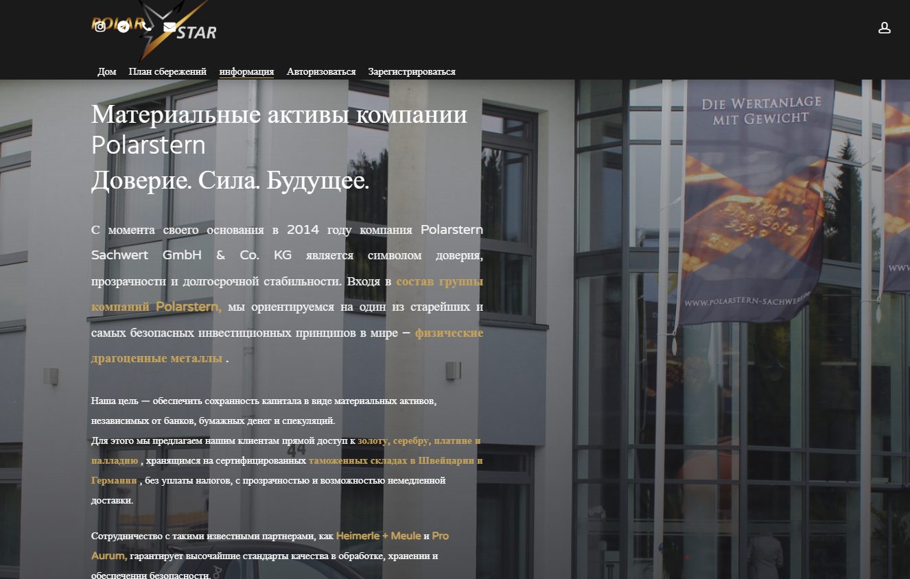 Во вкладке О нас проект называет себя немецкой компанией Polarstern Sachwert GmbH & Co. KG с историей работы с 2014 года. Аудитории обещают прямой выход на физические драгоценности — серебро, палладий, платину и золото. Хранится всё это, по заявлениям площадки, исключительно на сертифицированных таможенных складах Швейцарии и Германии. Авторы смело указывают на партнерства с такими участниками ниши, как Pro Aurum и Heimerle + Meule. А следить за сохранностью капитала предлагается круглосуточно через внутренний цифровой портал.