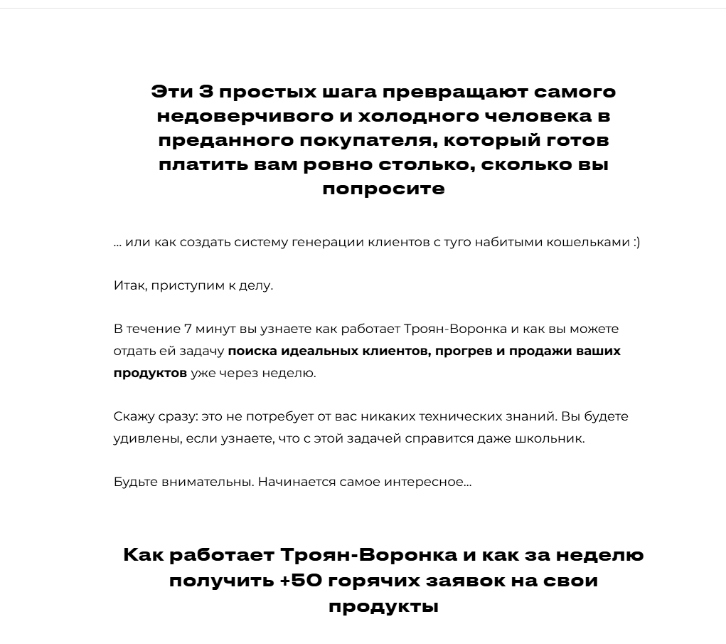 Основной продукт, который продвигает Полина – курс «Троян-воронка». Это система автоматических продаж, которая позволяет экспертам получать клиентов и деньги без личного участия, прогревов и бесплатных консультаций. Она состоит из трех элементов: