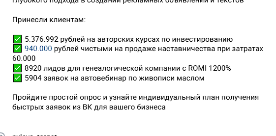 Чтобы доказать эффективность своей разработки, Полина публикует кейсы клиентов. Например, упоминаются цифры 5,4 млн рублей на курсах по инвестированию, 940к чистыми при затратах 60к на рекламу и 8920 лидов с ROMI 1200%.