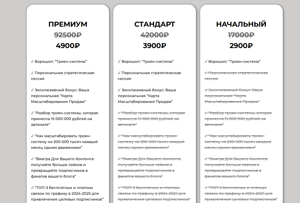Помимо «Троян-воронки», Полина Пылева предлагает несколько сопутствующих продуктов. Среди них – пошаговый разбор создания воронки, топ-3 связки по трафику и конструктор вирусных reels. Стоимость полного пакета на сайте указана как 92500 рублей, но по акции якобы 4900.