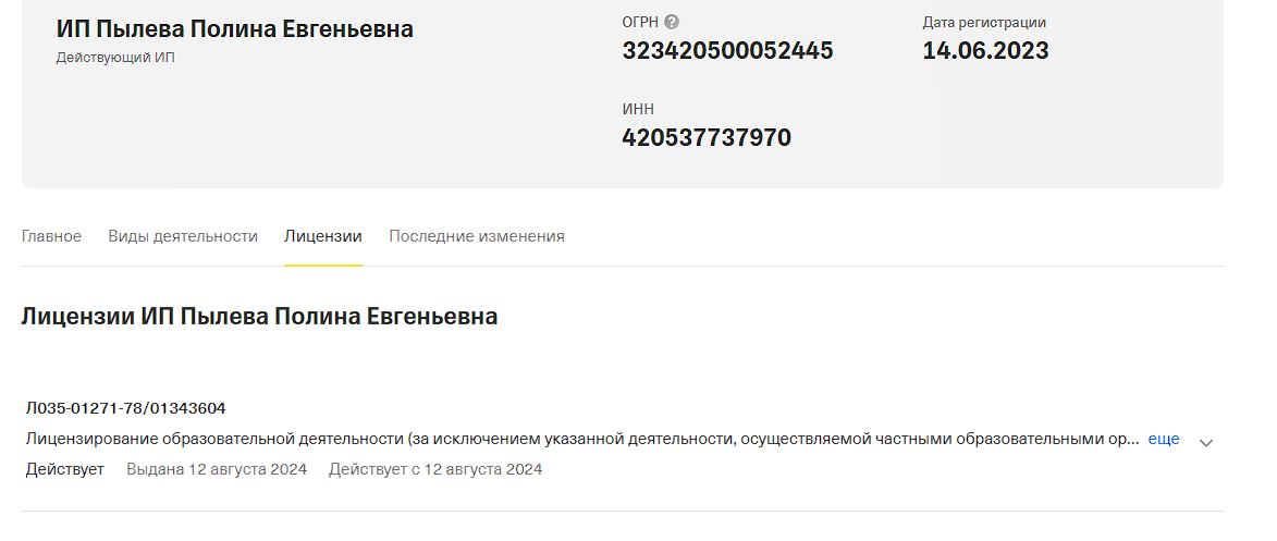 Коуч работает как ИП Пылева Полина Евгеньевна, дата регистрации – 14 июня 2023 года. У нее есть лицензия на образовательную деятельность № Л035-01271-78/01343604 от 12 августа 2024 года, выданная Комитетом по образованию. Это значит, что она имеет право обучать.