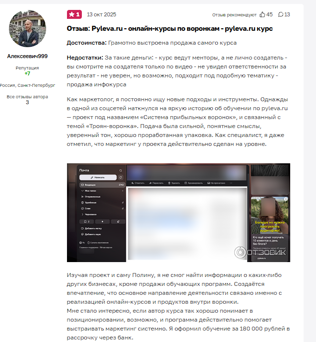 В независимых источниках упоминаний Полины Пылевой практически нет. Например, на ресурсе Otzovik – всего один отзыв о pyleva ru: юзер оценил сотрудничество с коучем в одну звезду. При этом отзыв развёрнутый и с комментариями – мы проанализировали его и выяснили следующее.