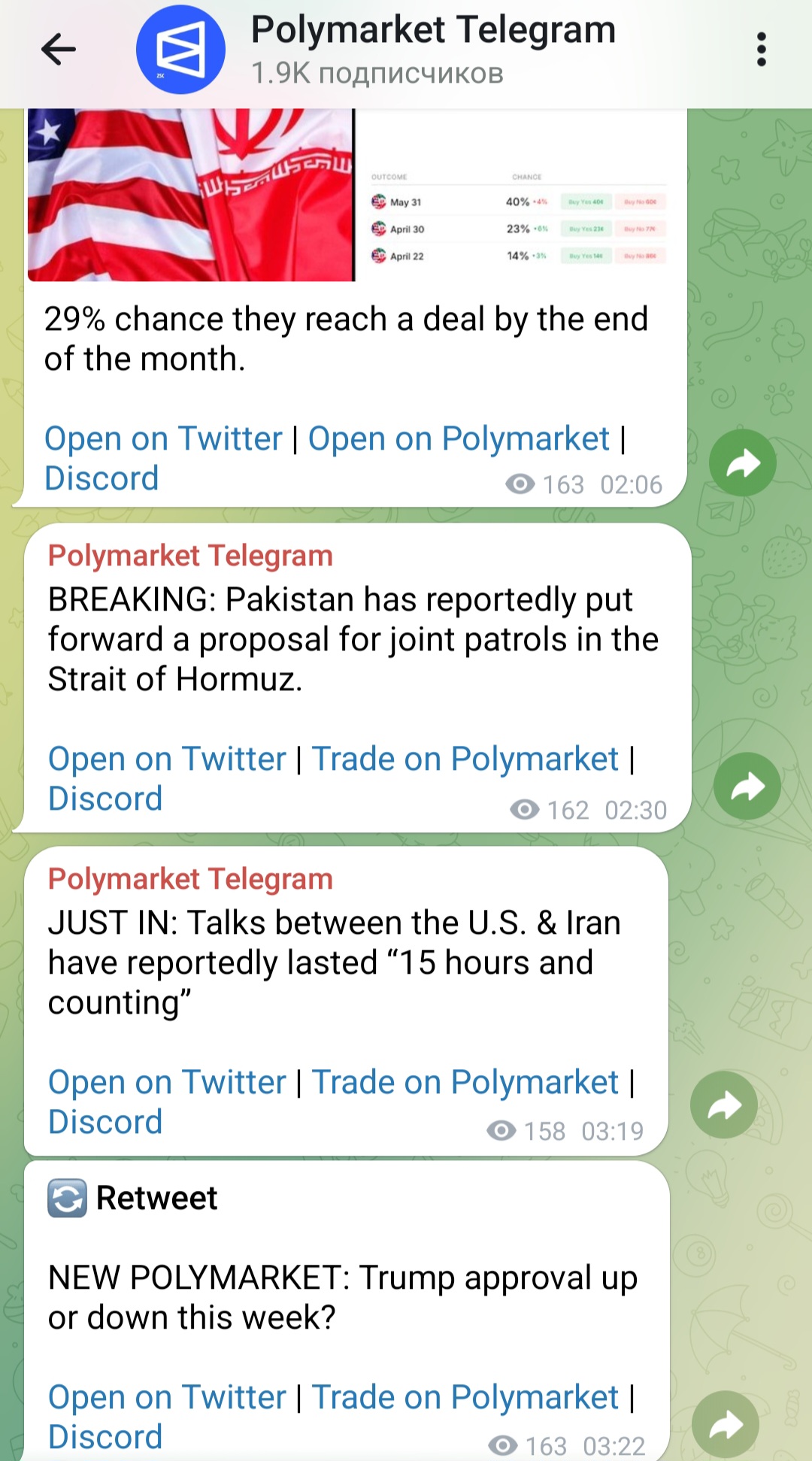 Также у Polymarket есть канал в Телеграмм. В нем публикуются актуальные события, на которые можно сделать ставку. Дается ссылка для перехода на официальный сайт. Аудитория насчитывает 1,9К человек. Посты просматривает в среднем 150 подписчиков. Скорее всего, администратор канала также пользуется накрутками. Комментарии и реакции в группе закрыты.