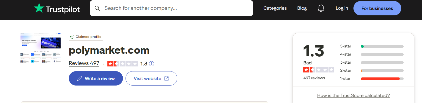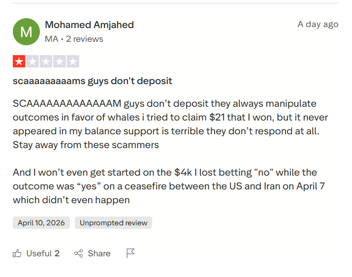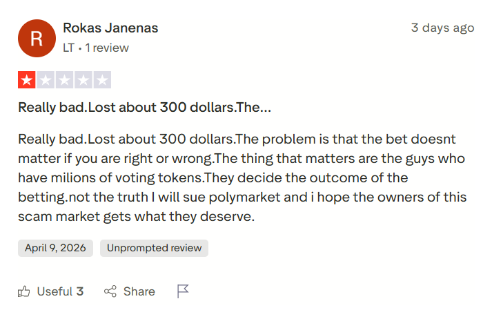 У Polymarket плохая репутация. На отзовиках проекту дают низкую оценку. Например, на Trustpilot платформа имеет рейтинг в 1,3 звезд из 5 возможных.