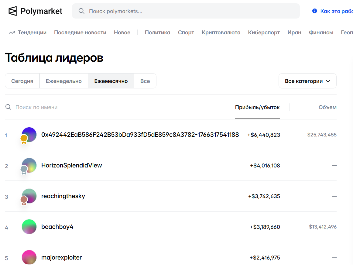 На сайте можно посмотреть таблицу лидеров. Судя по приведенным данным, один из пользователей заработал на Polymarket свыше 6,4 миллионов рублей.