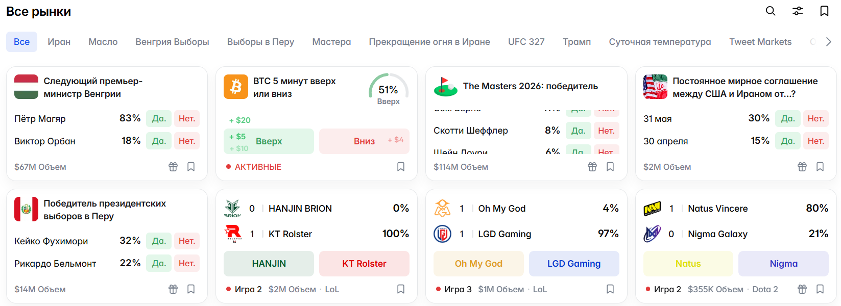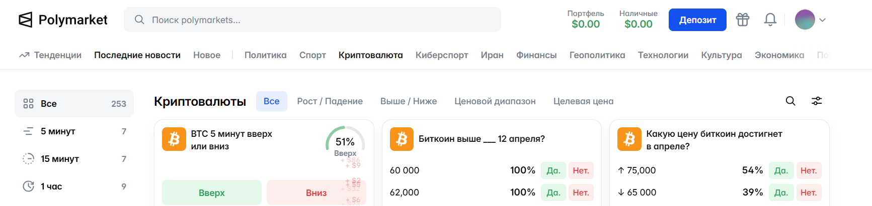 На Polymarket можно делать ставки на различные события, включая: