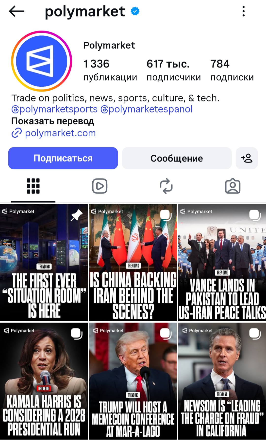 У Полимаркет есть страница в Инстаграм. На нее подписано свыше 617 тысяч человек. Выложено более 1330 публикаций о разных политических, финансовых событиях и возможности заработка на них. Дается ссылка на сайт для тех, кто хочет испытать удачу и сделать ставку.