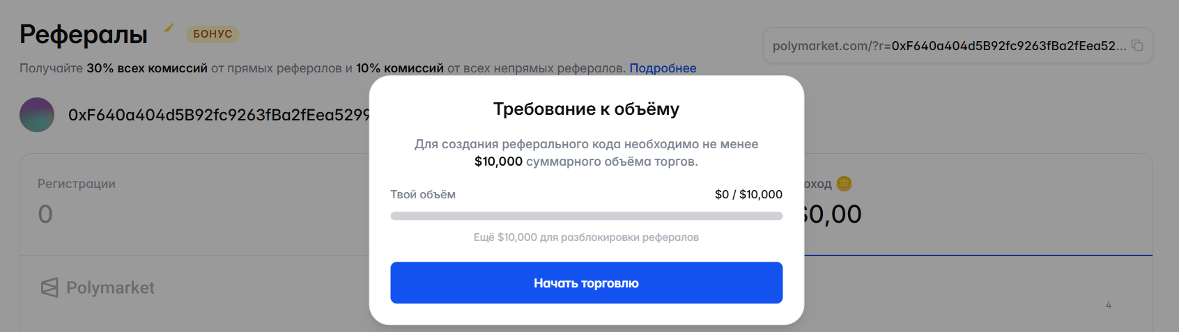 Также представители Polymarket com предлагают зарабатывать на участии в партнерской программе. За привлечение новых пользователей обещают начислять от 10 до 30% от полученной с них комиссии. Величина вознаграждения зависит от того, каким является реферал — прямым или непрямым. Для получения реферальной ссылки нужно выполнить одно условие — совершить сделок на сумму не меньше 10000 долларов.