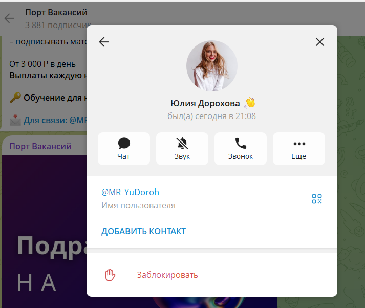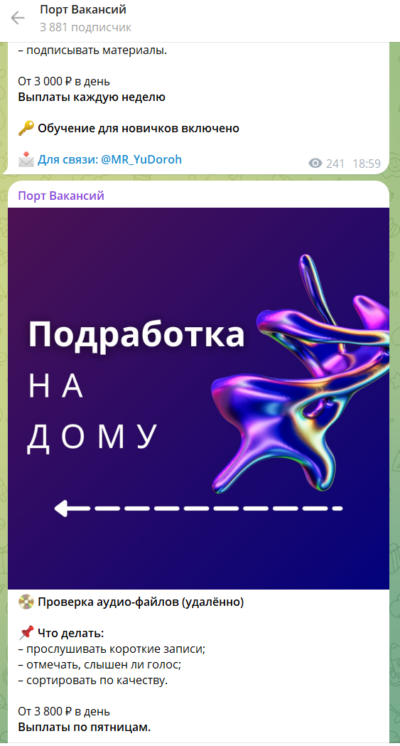Mr yudoroh – менеджер HR-канала в Телеграмм, в котором предлагают вакансии с оплатой от 3 тысяч рублей за смену и выше, с еженедельными выплатами и обучением. Можно ли верить проекту, не окажется ли столь заманчивое предложение пустышкой, мы решили выяснить в этой статье.