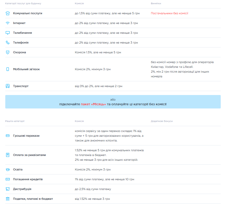 На сайте в разделе «Тарифы» можно ознакомиться со всеми комиссиями. Например, за оплату коммунальных услуг взимается до 1,5% от суммы платежа, но не менее 5 гривен, за погашение кредитов – 1%, но не менее 10 гривен, оплата интернета – до 2%, но не менее 3 гривен.