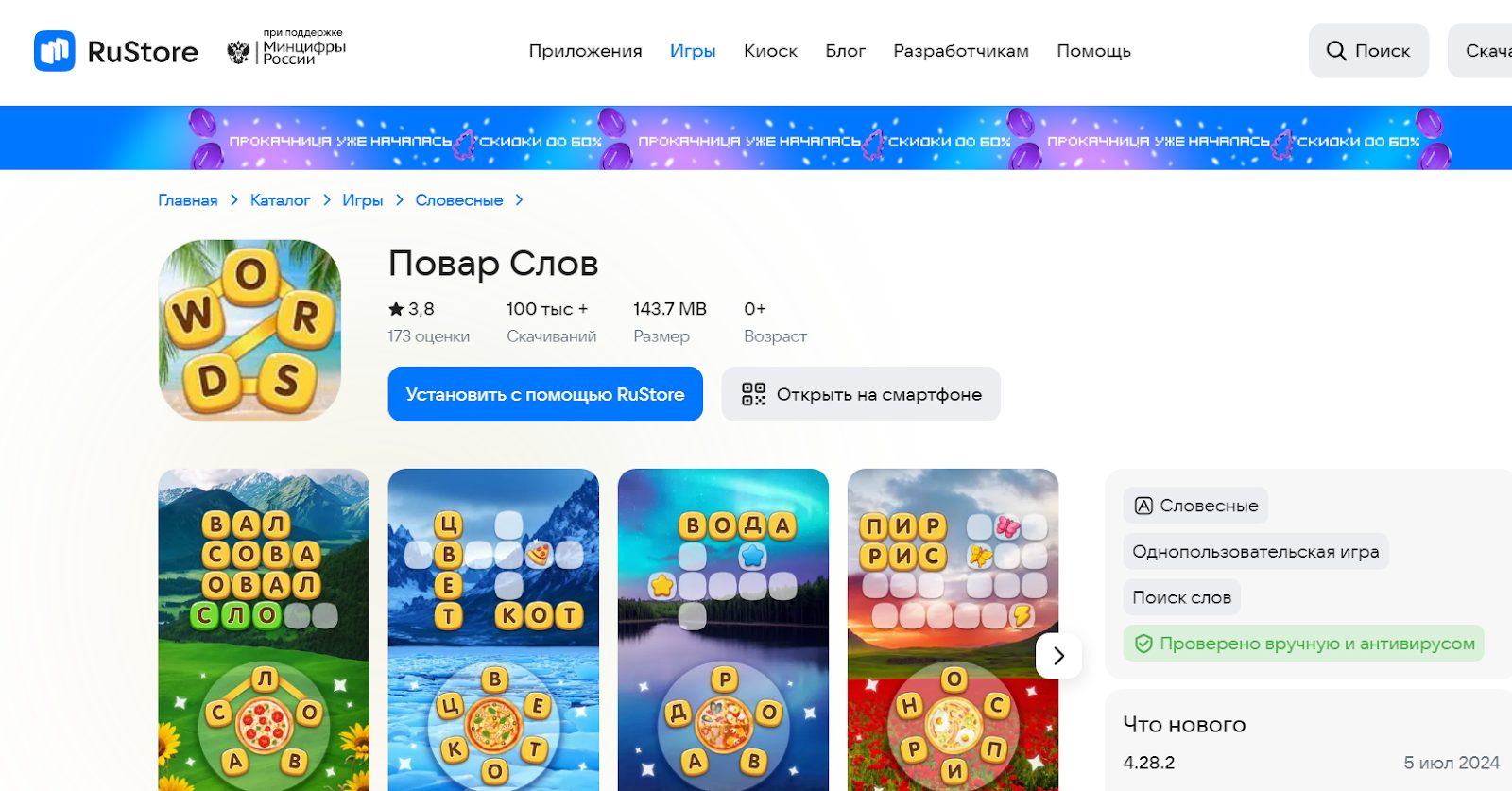 Загрузить эпп можно через RuStore. Размер файла составляет 143.7 МБ, и для получения доступа к нему нужно кликнуть “Скачать”.