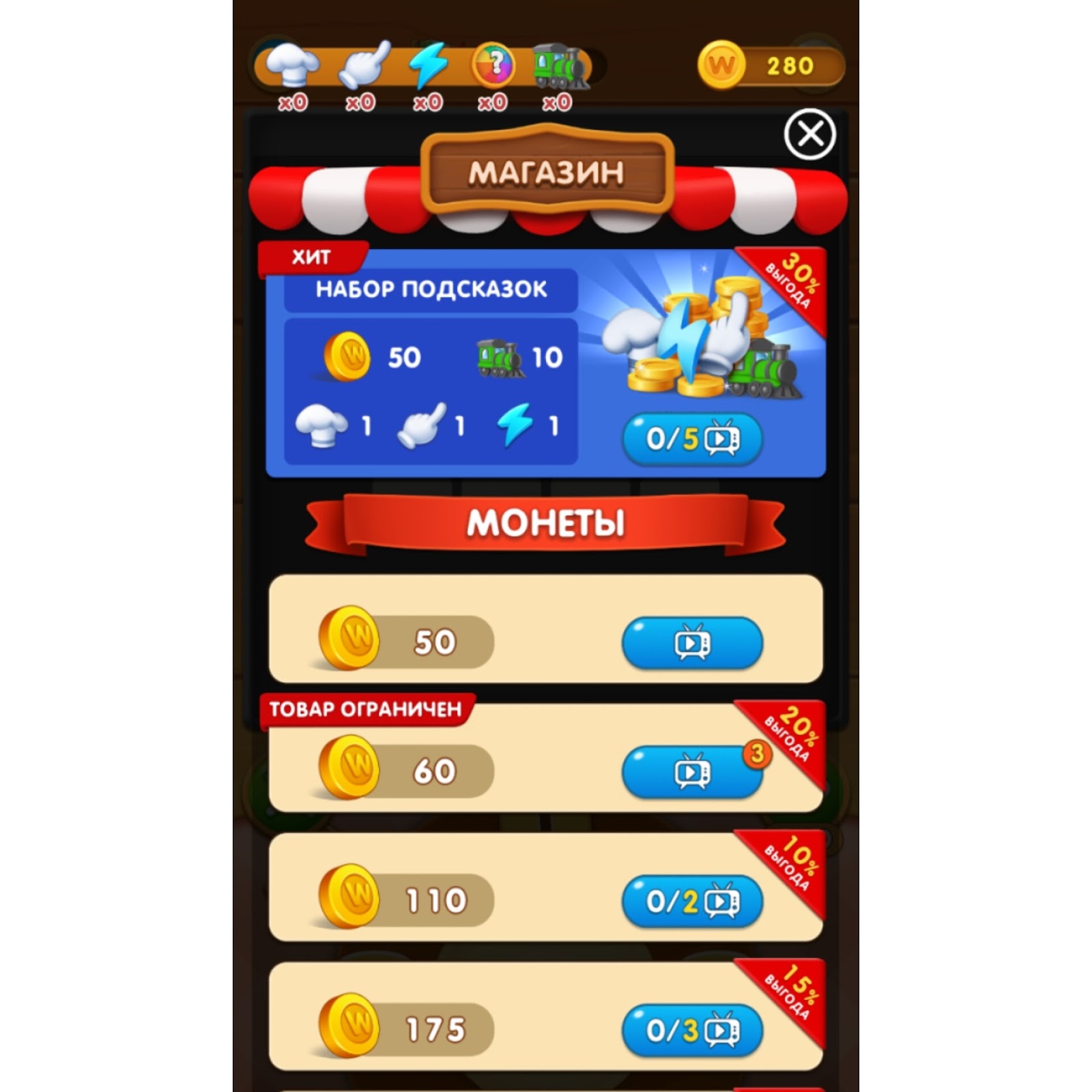 Для приобретения дополнительных монет в Повар Слов можно отправиться в магазин: