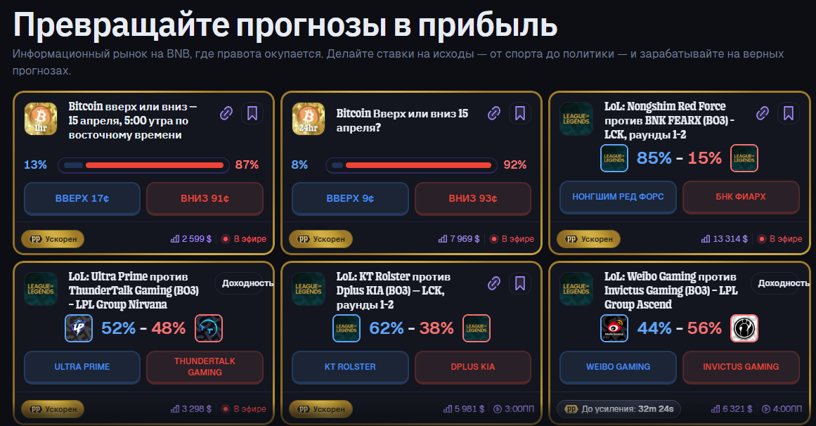 Predict FUN — биржа прогнозов от BNB. На площадке можно делать ставки на различные события. Коэффициенты рассчитываются по уровню вложений: от 99% до 1%. Сферы прогнозов: спорт, политика, фондовые рынки, блокчейн.