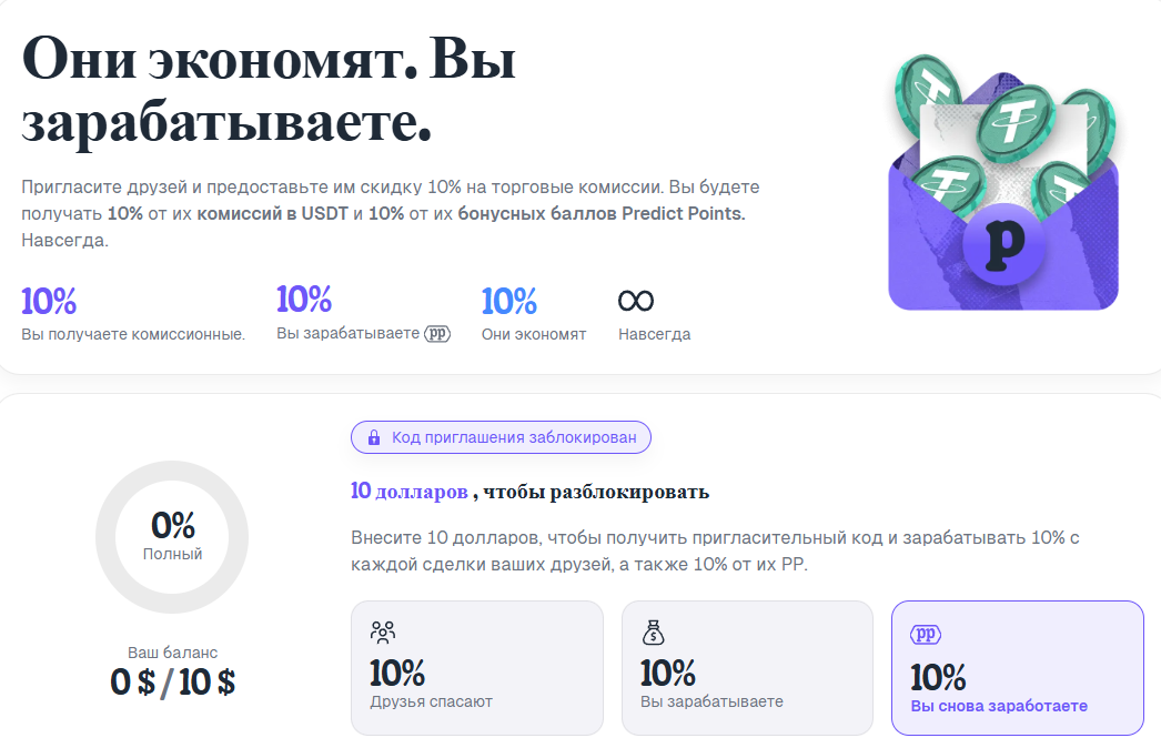 За каждую сделку берут комиссию — до 2% от суммы ставки. Реферальная программа предполагает, что человек будет получать скидку в 10%, то есть заплатит 1.8%. Пригласивший получит 10% от комиссий реферала. То есть, за каждую операцию будет получать по 0.0018% от ставки. Чтобы принять участие в реферальной программе необходимо внести минимум $10.