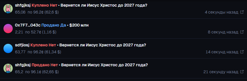 Ниже можно увидеть основные события, на которые пользователи покупают события. Люди приобретают лоты «да» или «нет», указана сумма и количество.