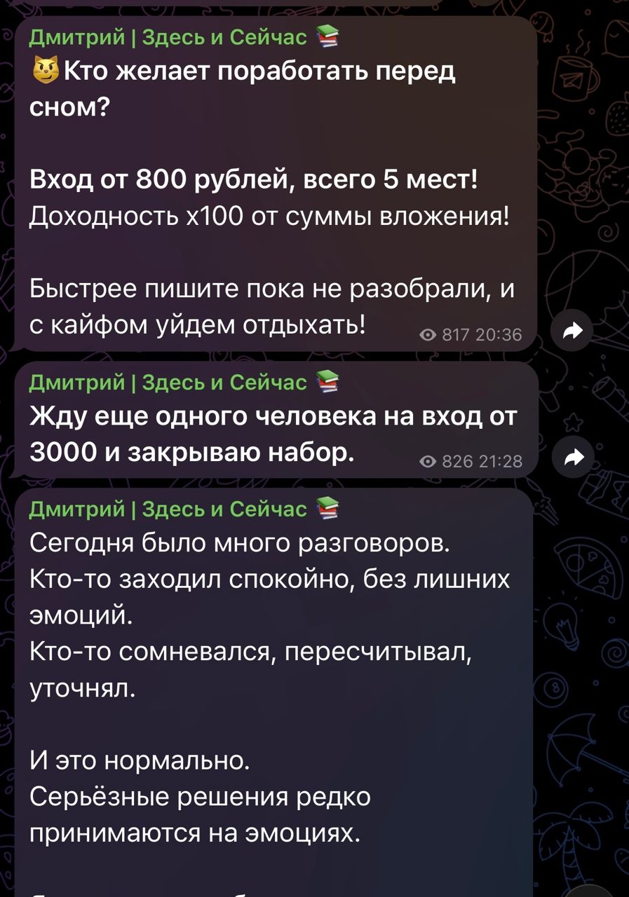 На самом деле такие горе-трейдеры как Дмитрий действуют всегда по идентичной схеме. Покупают телеграм-каналы и накручивают аудиторию, затем начинают активно рекламировать свои услуги и привлекать пользователей для сотрудничества обещаниями баснословной прибыли.