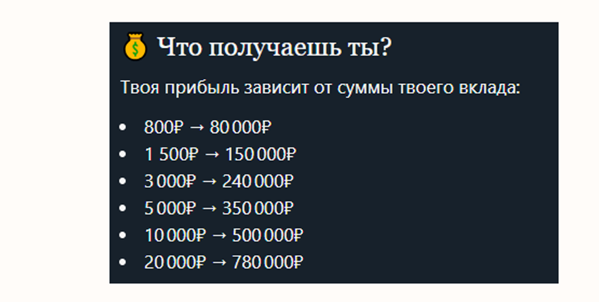 Стартовый минимальный взнос – 800 рублей, максимальная сумма для сотрудничества составляет 20 000 рублей, ее можно увеличить до впечатляющего показателя в 780 000 рублей. Буквально через сутки трейдер обещает выплатить прибыль.