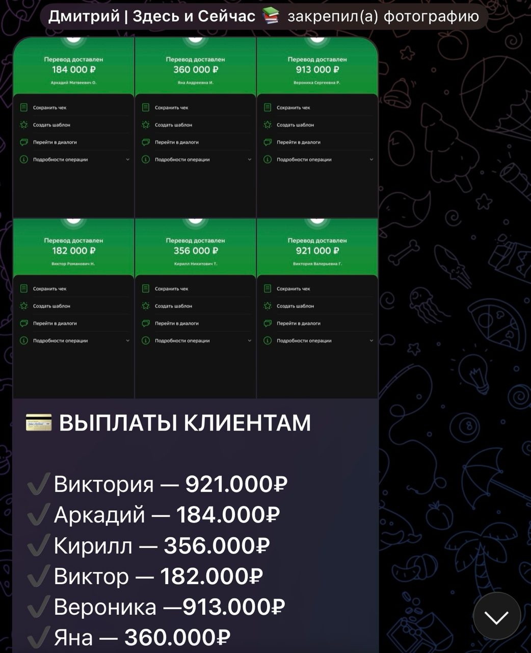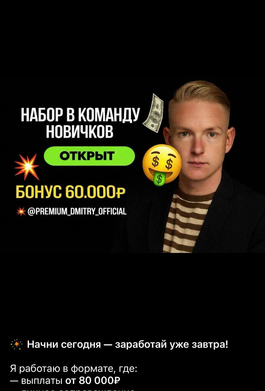 Затем нашему герою пришла идея создать свой телеграм-канал, чтобы совершенно бесплатно помогать подписчикам приумножить капитал. Этакий меценат с талантом к трейдингу. Доступ в его аккаунт «Дмитрий Здесь и сейчас» закрытый, но одобрение заявки приходит мгновенно. Вместе с одобрением пользователи начинают получать автоматические сообщения о получении бонусных 60 000 рублей. Для их получения достаточно написать Дмитрию в личку в Premium dmitry official.