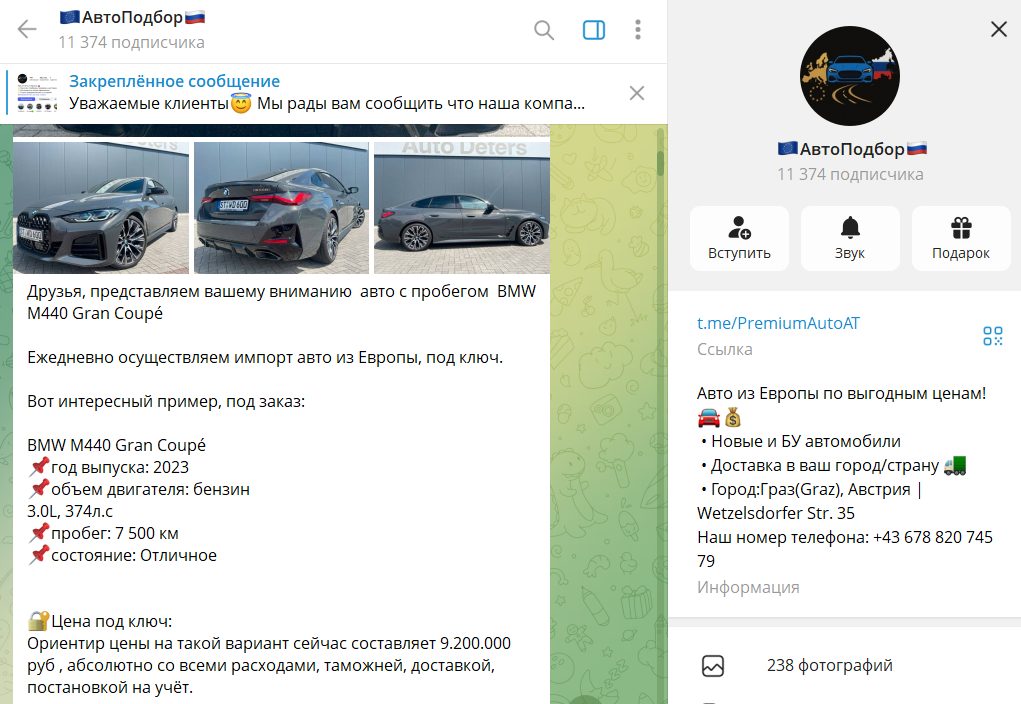 Запуск данного телеграмм-канала с ником PremiumAutoAt состоялся еще 4 марта 2024 года и тогда же был опубликован первый пост с презентацией услуг компании. В закрепленном сообщении админ обращается к уважаемым клиентам и заявляет о многолетнем опыте работы. Аудитории предлагают пригнать б/у автомобили из Европы и подбор новых моделей.