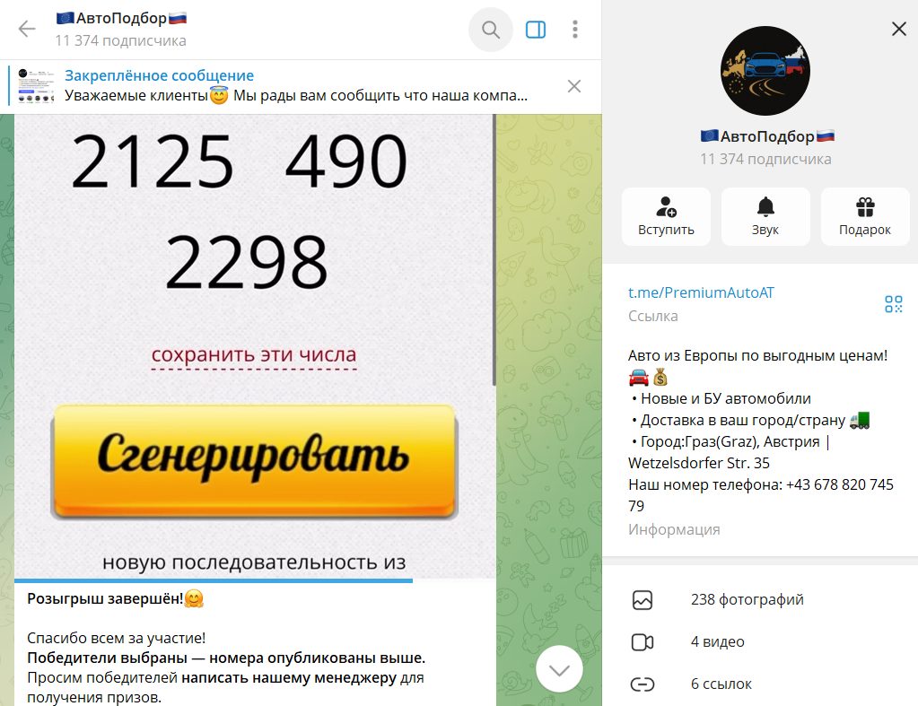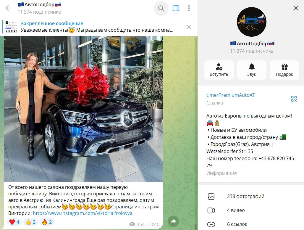«АвтоПодбор» – это телеграмм-канал, где предлагается пригон автомобилей из Европы. Обещают полное сопровождение от помощи в выборе, проверке и до оформления покупки, а также доставки по странам СНГ. Кроме того, на канале регулярно проводятся розыгрыши подарков в виде современных машин.