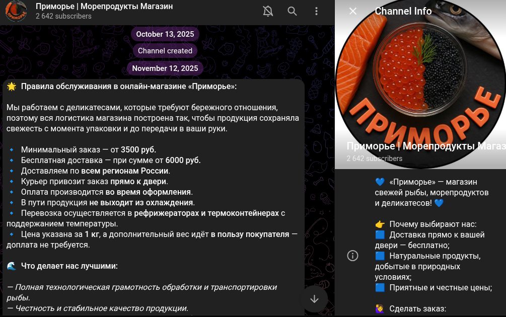 В описании сообщества команда лишний раз намекнула, что на телеграмм-канале «Приморье Морепродукты» пользователи покупают только свежие товары. Там же менеджеры рассказали про преимущества: доставка прямо к двери, натуральные продукты от природы, приятные и честные цены. Старт же маркетплейса был 13 октября 2025, а первый пост команда разместила уже через месяц.