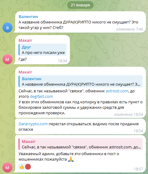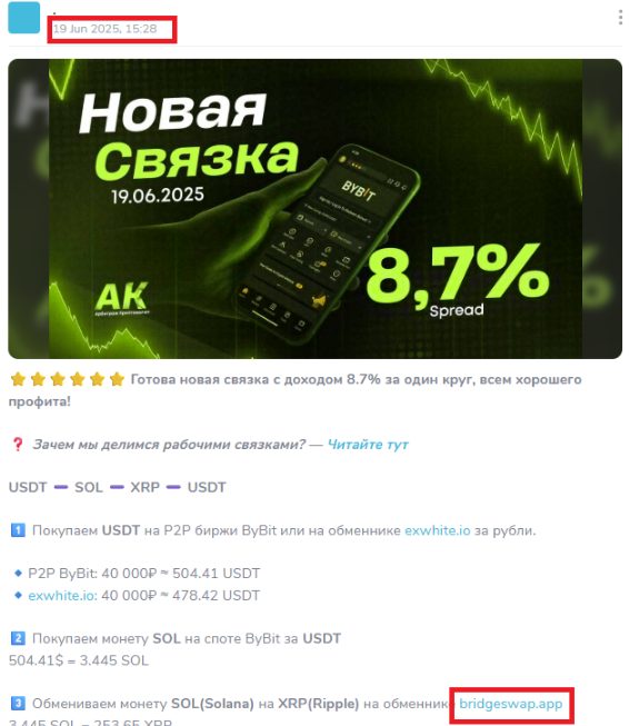 Он заявляет о нереалистично высоких спредах. При этом в каждой публикуемой связке присутствует скам-обменник, сомнительный сайт-однодневка. На канале, который раньше носил название АК Арбитраж Крипты, В середине июня 2025 года продвигался весьма подозрительный обменник: