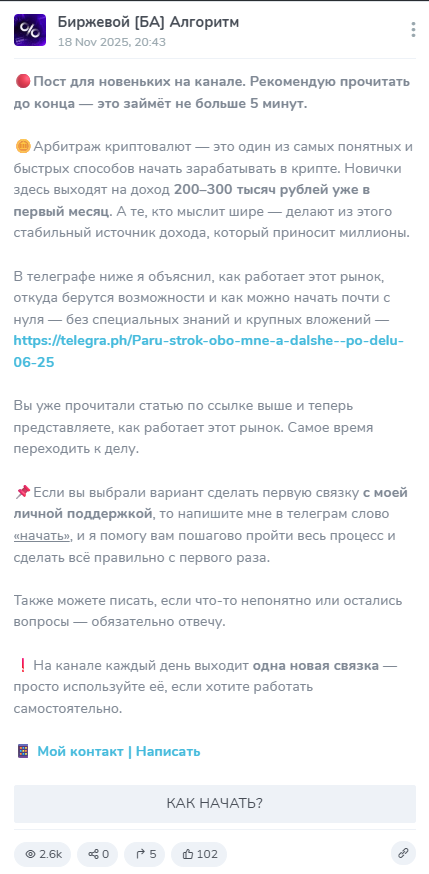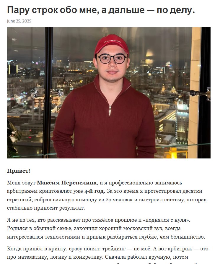 Легенда у арбитражника стандартная: сначала был простым парнем, зарабатывал мало, но потом пришел в крипту и деньги полились рекой. Пользователям автор предлагает криптоарбитраж как якобы доступный и надежный метод заработка. Однако даже на этом этапе легенда выглядит сомнительной, так как Максим не упоминает о высоких рисках для россиян, связанных с блокировками карт.