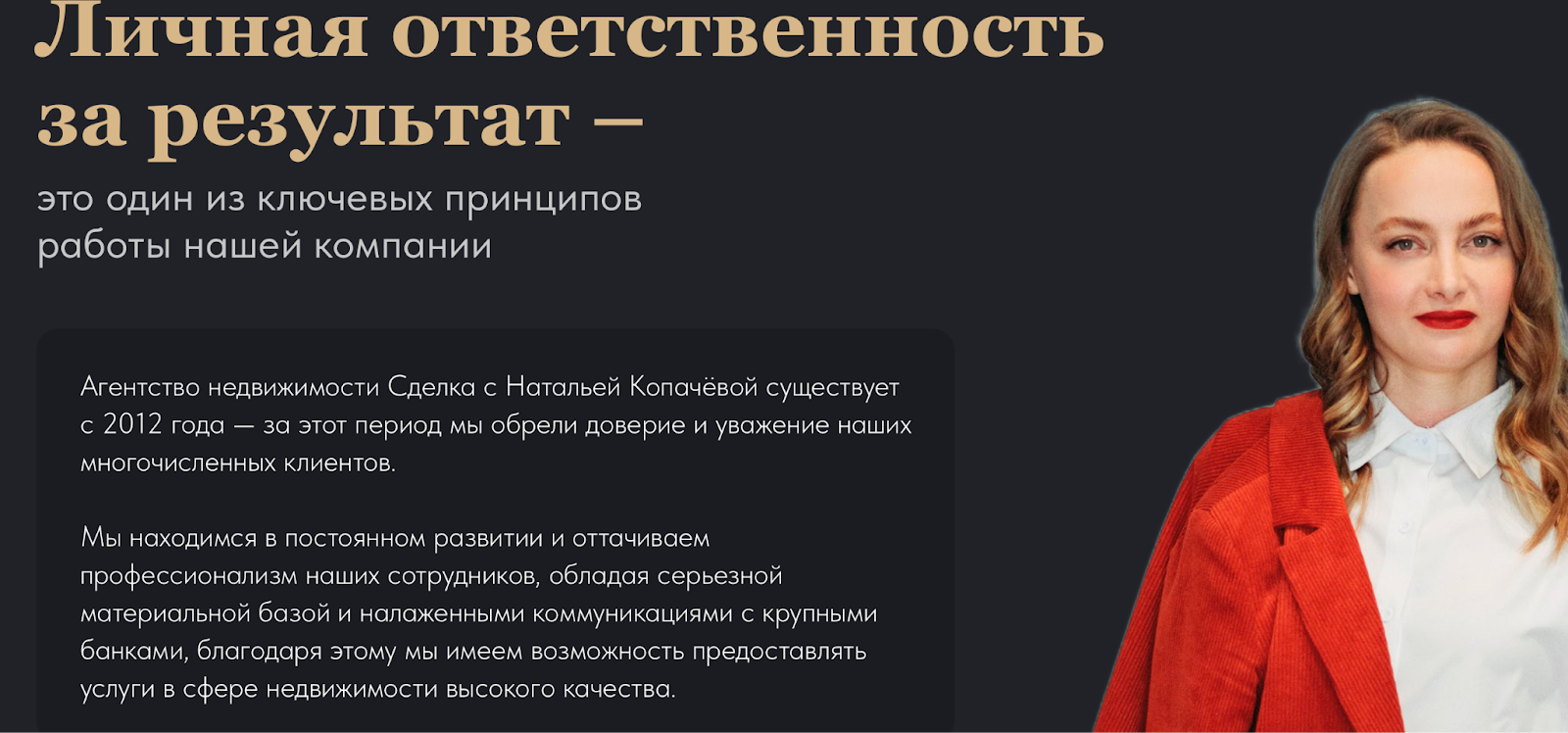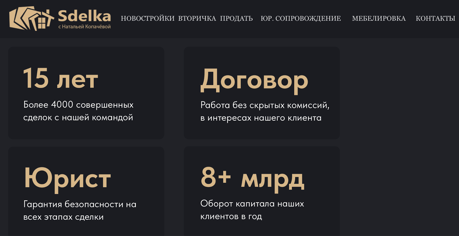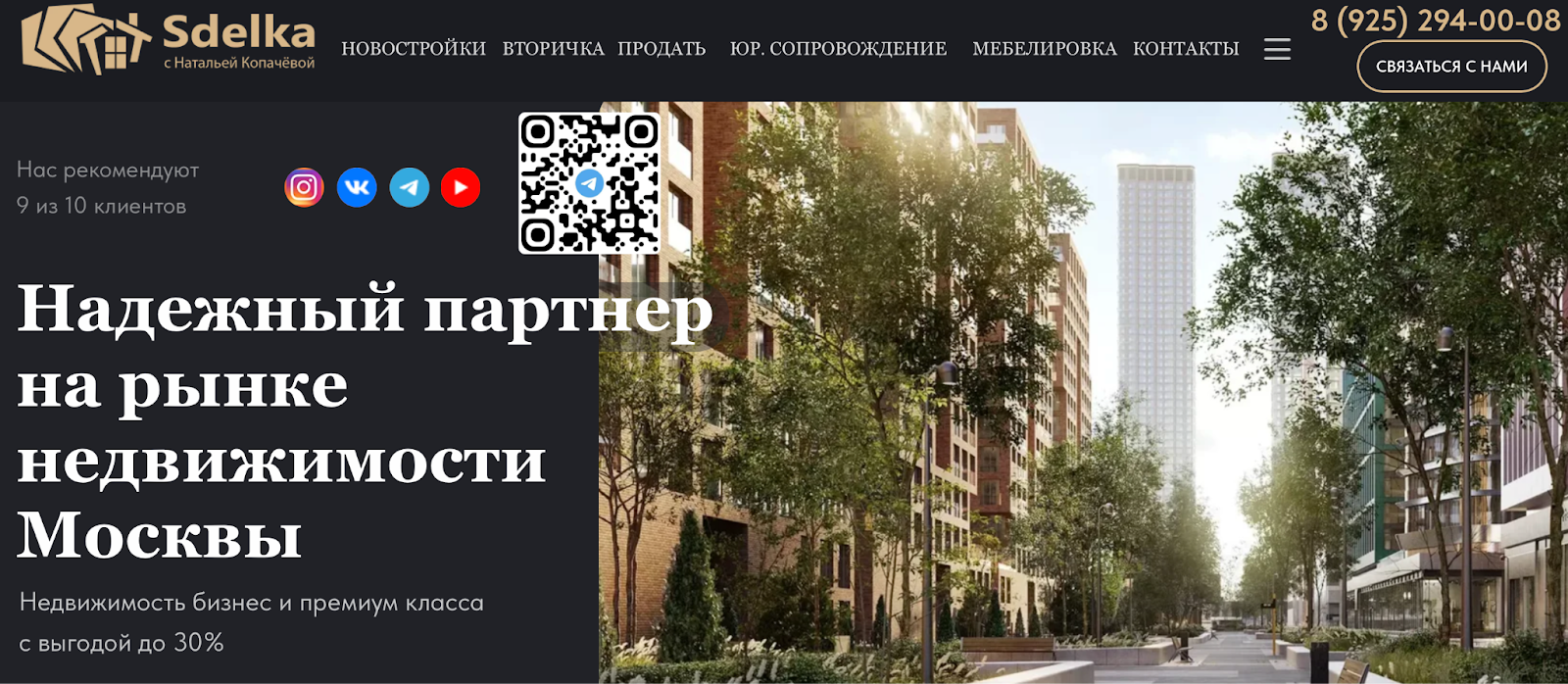 Перед нами — московская риэлтерская компания, известная как Sdelka Sdelka («PRO НЕДВИЖИМОСТЬ»). Руководит агентством Наталья Копачева, называющая себя опытным агентом по продаже московской недвижимости. Ее фирма помогает клиентам по ряду направлений: подбирает подходящие варианты, сопровождает сделки купли‑продажи, берет на себя оформление документов и юридические нюансы. Помимо сайта Копачева очень активно продает свои услуги в социальных сетях, ведет собственные блоги и инфопродукты.