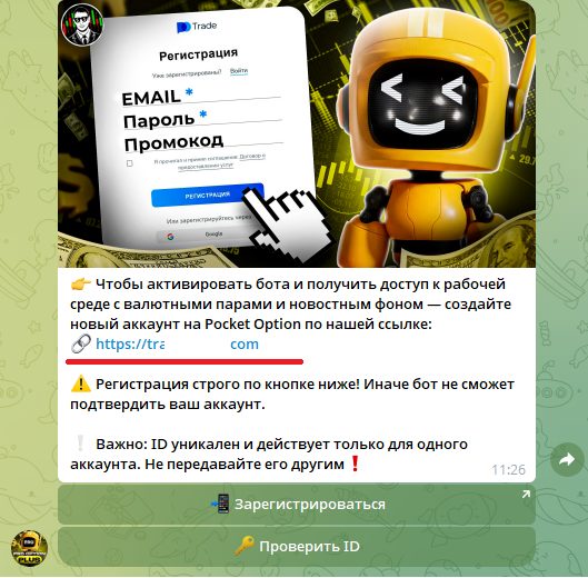 При запуске бота мы обнаружили один момент, который является ключевым в схеме Андрея. Чтобы воспользоваться приложением, нужно пройти регистрацию на бирже Pocket Option по его реферальной ссылке. Обман кроется в том, что трейдер, следуя сигналам бота, сливает свой депозит и в результате остается без денег, а Андрею начисляется бонусное вознаграждение от площадки.