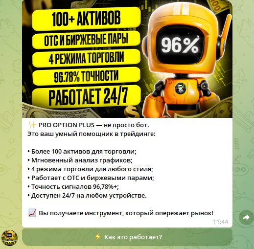 Pro Option Plus — бот в Telegram для трейдинга. По словам разработчиков, он якобы выдает подписчикам точные сигналы с высокой проходимостью. Звучит заманчиво: запустил программу и смотришь, как растет баланс. Но в ходе проверки мы обнаружили много несостыковок, которые указывают на мошенничество. Читайте подробнее об этом в нашем обзоре.