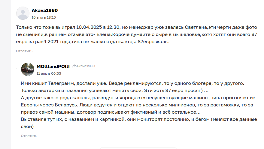 Аферисты даже не меняют фото призовых автомобилей, просто регистрируют новые ТГ каналы и разводят пользователей на небольшие суммы денег. Конечно, из-за 100 евро никто не будет обращаться в полицию, начинать длительные судебные разбирательства. Жертвы обмана просто зафиксируют убыток и получат полезный негативный опыт.