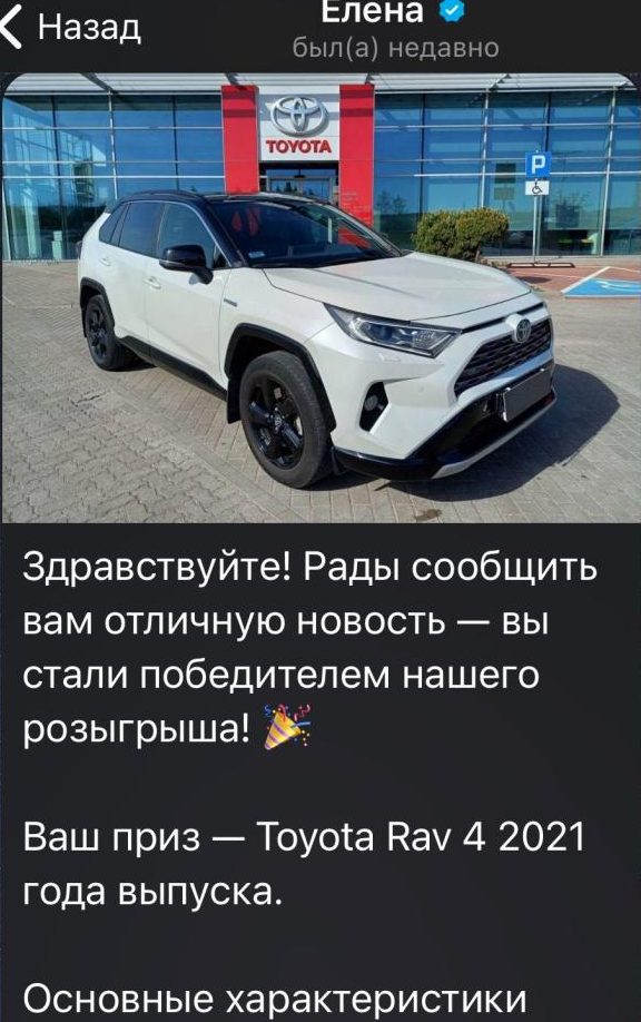 Людям, подписавшимся на канал, или просто интересующимся автомобильной тематикой, вдруг приходят сообщения, что они стали счастливыми обладателями приза. Выигрыш – автомобиль.