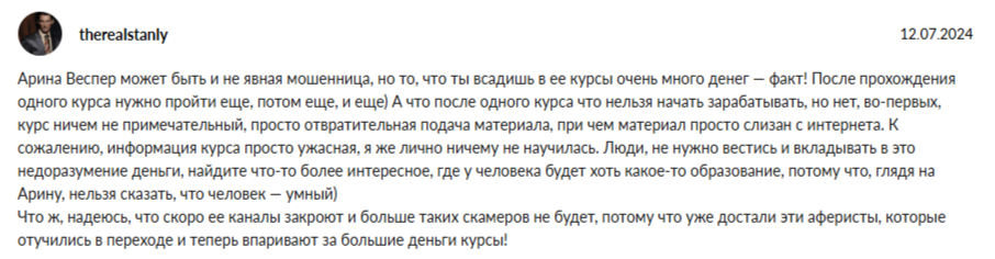 О новом курсе Арины Веспер в интернете пока нет комментариев. С чем это связано — неясно, но мы обнаружили довольно много противоречивых откликов о самом коуче и других ее образовательных программах. Среди фидбеков преобладают гневные высказывания в адрес преподавателя. Веспер называют инфоцыганкой, которая предлагает за деньги бесполезную информацию.
