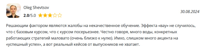 В очередном отклике клиент также жалуется на некачественное обучение. Пользователь сообщает, что ни базовый курс, ни программы посерьезнее не приносят пользы. Также ученик сообщает, что среди материалов одна вода и мало рабочих стратегий.