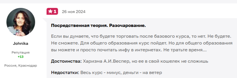 Следующий комментарий взят с портала «Отзовик», на котором репутация наставника также хромает. Одна из учениц жалуется на пустую подачу материала и пишет, что вся информация взята из общедоступных источников.