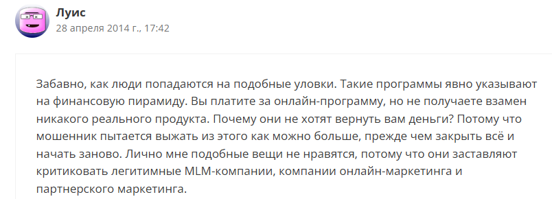 Один из пользователей в своем отзыве о данной компании называет ее финансовой пирамидой. Мошенники выманивают из людей деньги, а потом закрывают свой проект и сразу запускают новый.