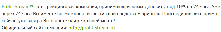 На разных сайтах можно встретить агрессивную рекламу «Профитстрим», которая призывает инвесторов вкладывать деньги в «депозиты под 10% за 24 часа». Заявленная доходность составляет несколько тысяч процентов в год, обеспечить ее совершенно невозможно. Подобное обещание с головой выдает мошенников.